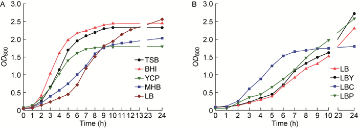 2 结果 2.1 生长曲线Newman菌株在TSB、BHI、YCP、MHB和LB培养基中的生长曲线(图 1A)显示,其在BHI、TSB和YCP培养基中生长速度较快,2~3 h后进入对数生长期,7~9 h后进入平台期;在MHB和LB培养基中生长较慢,3~4 h后进入对数生长期,12 h后进入平台期。