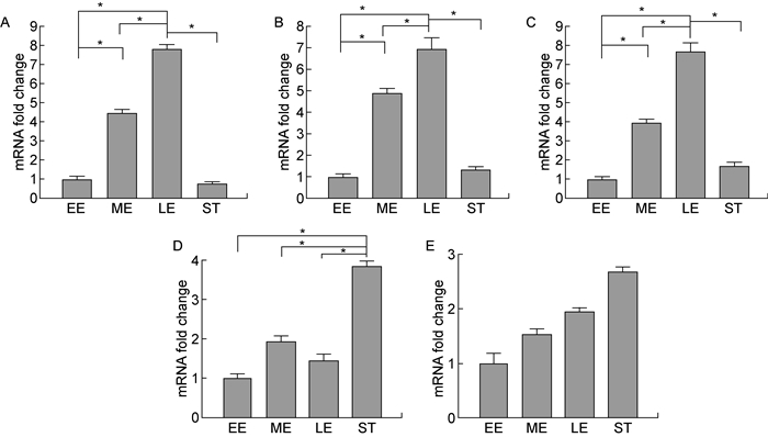 2.2 生长阶段对lukE表达的影响根据图 1A中的生长曲线,挑选TSB、BHI、YCP、MHB、LB培养基中对数生长早期、中期、晚期及平台期细菌进行研究。在TSB、BHI和YCP培养基中,从对数生长早期到晚期,lukE基因表达显著增加,并在对数生长晚期达到最高水平(图 2A、2B、2C)。相对于对数生长早期,对数中、晚期变化倍数分别为TSB:4.48和7.82;BHI:4.90和6.90;YCP:3.97和7.71(P<0.05)。随后进入平台期,lukE基因转录水平显著下降,与对数生长早期水平相当(P>0.05)。在MHB培养基中,对数生长早、中、晚期lukE基因表达无显著差异,而平台期显著增加(为对数早期的3.85倍)(P<0.05)(图 2D)。在LB培养基中,lukE基因表达在整个生长周期中虽有增加趋势,但差异没有统计学意义(P>0.05)(图 2E)。