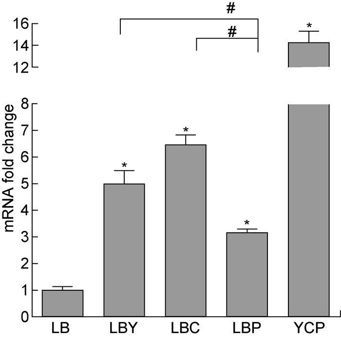 为研究YCP培养基成分对lukE基因表达的影响,分别检测Newman菌株于LBY、LBC和LBP培养基5 h培养物中lukE mRNA,以LB和YCP培养基同一时间的培养物为对照。
