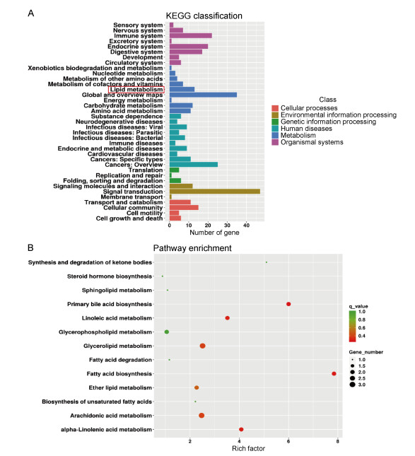 经KEGG分析发现,在“代谢”这一功能分类中,除全局和概览通路(global and overview maps)外,差异基因数目最多的是脂质代谢通路,如图 2A。KEGG富集到243条通路,通过进一步分析脂质代谢中的次级通路富集发现,脂肪酸合成通路的富集程度最高,即富集因子最高;其次为初级胆汁酸合成通路、亚油酸代谢途径,如图 2B。