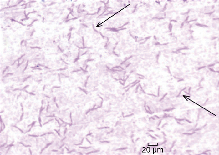 | 图 1 显微镜下革兰氏染色呈弯曲形态的哈特草螺菌 Fig. 1 A curved form of H. huttiense after Gram's stain observed using a microscope |