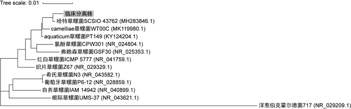 挑取培养24 h的新鲜菌落,采用直接转移法制备样本,使用Microflex LT质谱仪(德国布鲁克公司)重复鉴定20次,结果为哈特草螺菌(分值2.137± 0.074)或aquaticum草螺菌(分值1.916±0.136)。