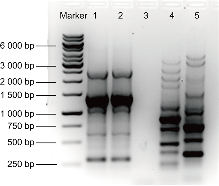 | 注:泳道1号到5号分别是来自血液、粪便的哈特草螺菌、无模板阴性对照、ATCC BAA-1705和ATCC 700603;DNA Marker片段大小已在左侧标记。 Lanes 1 to 5 were H. huttiense from blood, H. huttiense from feces, no template control, ATCC BAA-1705 and ATCC 700603, respectively. The sizes of the marker DNA are given on the left. 图 4 哈特草螺菌ERIC-PCR电泳图谱 Fig. 4 ERIC-PCR fingerprints of H. huttiense |