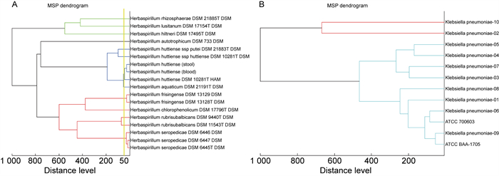 | 图 5 MALDI-TOF MS对哈特草螺菌和肺炎克雷伯菌的MSP聚类分析树状图 Fig. 5 Dendrogram of MSP cluster analysis by MALDI-TOF MS for H. huttiense and Klebsiella pneumoniae |