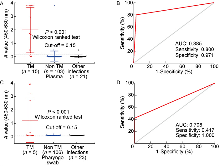 | 图 1 TM抗原试剂盒检测血浆/咽拭子样本的A值散点图和ROC曲线分析 Fig. 1 A values and ROC curve analysis of TM antigen detection kits (plasma/ pharyngeal swabs) |