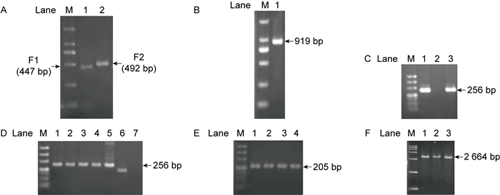 2 结果分析 2.1 菌株构建为了检测SopE蛋白的表达量,本文构建了携带sopE∷3×Flag的WT-pBAD33、ΔsciG-pBAD33与C-ΔsciG菌株。首先,由PCR扩增sopE基因上、下游片段F1、F2, 电泳结果如图 1A所示,以F1、F2片段为模板,PCR扩增,将F1、F2片段连接成F片段,结果如图 1B所示。F片段与pGMB151质粒酶切后酶连,热击到E.coli λ372感受态细胞中,PCR扩增筛选阳性重组质粒,电泳结果如图 1C所示。阳性重组质粒送测序,序列比对完全正确后电击到WT与ΔsciG感受态细胞中,筛选同时含有短片段与长片段的单克隆,在5%蔗糖板上稳定传3代后,再在普通LB平板上稳定传3代,经PCR鉴定发现只有长片段,即携带sopE∷3×Flag的WT与ΔsciG菌株构建成功,电泳结果如图 1D所示。将pBAD33空载体电击到携带sopE∷3×Flag的WT与ΔsciG菌株中,经PCR鉴定后筛选阳性菌株,电泳结果如图 1E所示。将sciG-pBAD33载体电击到携带sopE∷3×Flag的ΔsciG菌株中,由PCR鉴定筛选阳性菌株,电泳结果如图 1F所示。