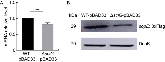 为了研究在巨噬细胞中T6SS对T3SS-1效应蛋白SopE表达的影响,本研究使用WT-pBAD33、ΔsciG-pBAD33感染巨噬细胞,提取RNA进行qRT-PCR检测sopE mRNA水平,提取蛋白使用WB检测SopE蛋白表达水平,结果显示:ΔsciG-pBAD33的SopE表达水平在巨噬细胞中低于WT-pBAD33(见图 2),说明在巨噬细胞中,T6SS的缺失抑制了SopE的表达。