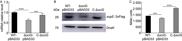 在模拟巨噬细胞内环境下培养WT-pBAD33、ΔsciG-pBAD33和C-ΔsciG菌株,并进行qRT-PCR、WB与β-半乳糖苷酶活性检测实验,结果显示:在模拟巨噬细胞内环境中,ΔsciG-pBAD33的SopE表达水平较于WT-pBAD33显著降低,C-ΔsciG的SopE表达水平较于ΔsciG-pBAD33部分恢复(见图 3A、3B),ΔsciG-pBAD33的sopE基因启动子的mRNA表达水平较于WT-pBAD33与C-ΔsciG显著下降(P < 0.01)(见图 3C)。说明在模拟巨噬细胞内环境中,T6SS的缺失使SopE的表达受到抑制,与在巨噬细胞中的结果一致。