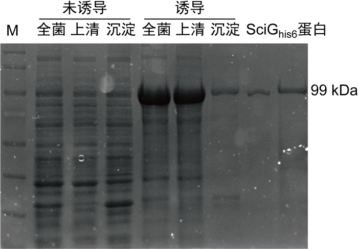 1.2.7 SciG蛋白的表达和纯化接种sciG-pET28a-BL21重组蛋白表达菌至液体LB培养基中培养至对数期(OD600nm约为0.6),加入0.2 mmol/L异丙基硫代-β-D-半乳糖苷(isopropylthio-β-D-galactoside, IPTG),30 ℃,180 r/min诱导6 h。收集菌体后超声波破碎,离心收集上清液,用0.45 μm的滤嘴过滤掉杂质后用Ni柱纯化,然后于透析袋中冰上透析4 h后,用PEG2000吸去透析袋中部分水分以浓缩蛋白,检测浓度后使用SDS-PAGE分析其纯度,置于-80 ℃保存。