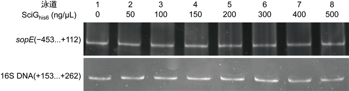 本研究利用EMSA检测SciG蛋白与sopE基因的相互作用,结果显示:SciG蛋白与sopE基因的启动子区域未发生结合(见图 5),说明SciG蛋白不能通过直接与sopE基因的启动子区域结合来调控sopE基因的表达,而是间接调控sopE基因的表达。