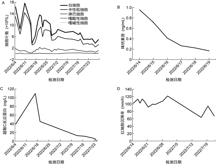 | A: Blood cells count. B: Procalcitonin. C: Hypersensitive C-reactive protein. D: Erythrocyte sedimentation rate (ESR). 图 2 临床常用感染指标检查结果 Fig. 2 Detected results of clinical commonly used infection indicators |