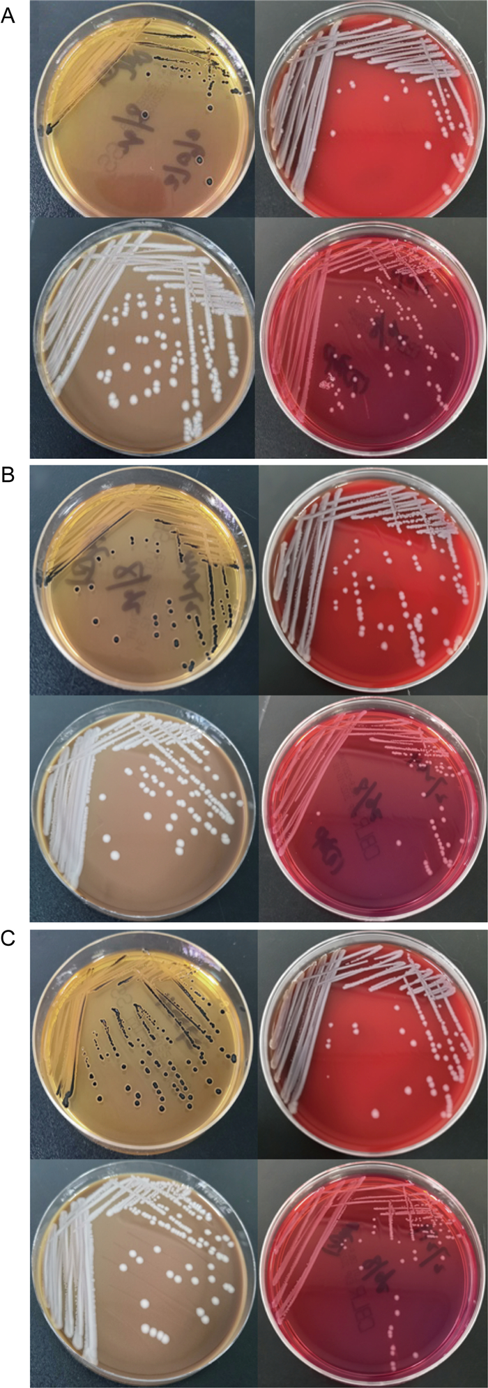 2 病原学检查 2.1 细菌鉴定无菌条件下抽取患者左上肢和右下肢的静脉血全血,左上肢全血分别依次注入至需氧培养瓶和厌氧培养瓶各10 mL,右下肢全血分别依次注入至需氧培养瓶和厌氧培养瓶各10 mL,经全自动微生物血培养系统(Bact/ALERT 3D,法国生物梅里埃公司)35 ℃孵育12~18 h后,将培养后的产物分别接种至不同的琼脂平板中继续培养。本研究使用的血培养瓶均是与全自动微生物检测系统配套使用的培养瓶。在培养箱(35 ℃,体积分数5% CO2)培养24 h后,血琼脂平板(广州市迪景微生物科技有限公司)上长出表面光滑、湿润、边缘整齐,直径2~3 mm的圆形灰白色菌落;中国蓝琼脂平板(广州市迪景微生物科技有限公司)上长出表面光滑、湿润、边缘整齐,直径2~3 mm的圆形无色半透明菌落;SS琼脂平板(郑州安图生物工程股份有限公司)上长出不透明、中心黑色菌落(见图 3)。