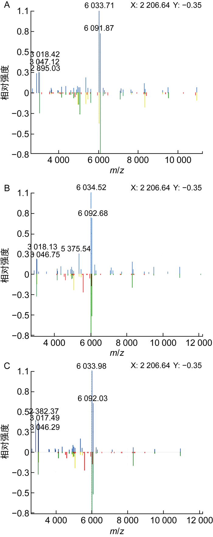 | A、B、C分别为样本27090、27224、27299质谱谱库对比图。 A, B and C are the mass spectrum library comparison charts of samples 27090, 27224 and 27299, respectively. 图 4 基质辅助激光解吸飞行时间质谱分析 Fig. 4 Analysis of matrix-assisted laser desorption/ionization time of flight mass spectrometry |