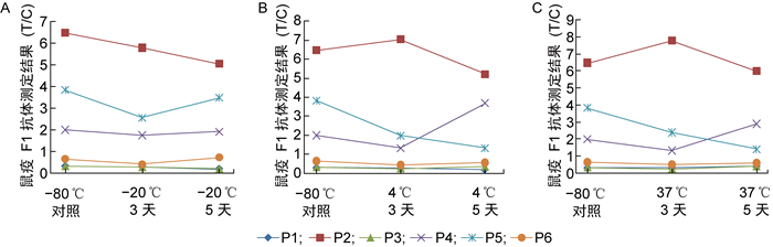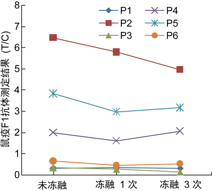 冻融1次及3次后,6份阳性参考品的F1抗体检测结果均仍为阳性,且F1抗体水平与未冻融对照相比无显著性差异(均P>0.05)(见图 1);最低检出限参考品冻融3次后的最低检出水平与未冻融对照一致。