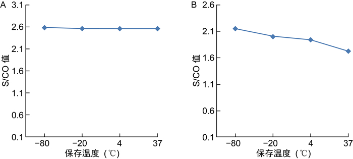 | A: The results of accelerated stability test for 14 d. B: The results of accelerated stability test for 28 d. 图 3 最低检出限参考品加速稳定性试验结果 Fig. 3 Results of accelerated stability test of minimum detection limit reference |