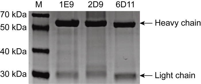 2 结果 2.1 成功获得3株人鼠嵌合抗体前期通过噬菌体抗体展示技术从免疫RBD蛋白的小鼠的抗体库中筛选获得了靶向SARS-CoV-2 RBD的小鼠抗体可变区基因,并通过基因重组技术将小鼠重链可变区基因和轻链可变区基因分别与人IgG重链恒定区和轻链恒定区相连,构建了人鼠嵌合抗体。本研究通过Expi293真核表达系统表达抗体,采用Protein A纯化后得到3株人鼠嵌合抗体,并将其命名为1E9、2D9和6D11,经SDS-PAGE验证后发现嵌合抗体条带正确(重链条带大小约55 kDa,轻链约25 kDa,重链∶轻链约为2∶1),且纯度良好,具体如图 1所示。
