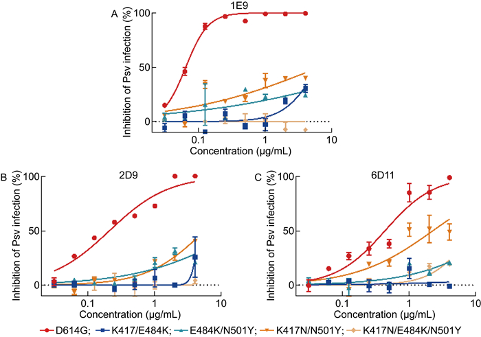 RBD结构域中存在着一些抗体结合的关键位点,比如K417、L452、E484和N501等,这些关键氨基酸的替换可导致病毒对中和抗体的逃逸。对中和实验结果进行分析后发现,Beta、Gamma和Omicron变异株假病毒对嵌合抗体表现出明显的逃逸现象(见图 3),而这些变异株的RBD结构域存在K417T/N、E484K/Q/A或N501Y突变,因而本文推测这些突变位点可能是抗体结合的关键位点。随后检测这3株抗体对含有K417N、E484K和N501Y突变位点的假病毒的中和活性。由于D614G突变对S蛋白结构具有一定的影响,本研究也检测了抗体能否中和含有D614G突变的假病毒。结果发现这3株抗体对D614G点突变的假病毒仍然具有较好的中和活性,但对含有K417N、E484K和N501Y突变的假病毒的中和活性明显降低,IC50值已经在检测线以下(见图 6),提示这3个突变位点可能是这几株抗体与SARS-CoV-2的RBD结合的关键位点。RBD结构域中其余位点对抗体与RBD结合的影响有待进一步研究。