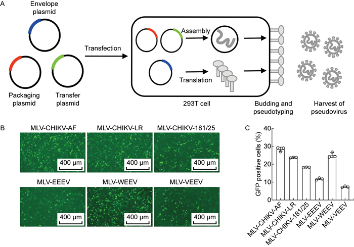 2 结果 2.1 含甲病毒包膜蛋白的假病毒颗粒的构建使用三质粒系统包装假病毒,包括表达甲病毒包膜蛋白的表达质粒(pC-env)、包装质粒(MLV-gag/pol)和转移质粒(pMIG-GFP),构建策略如图所示(见图 1A)。将三质粒共转染进293T细胞,48 h后收集细胞上清液,感染BHK-21细胞,并通过荧光显微镜和流式细胞术检测GFP的表达(见图 1B、1C)。结果显示,所有假病毒颗粒均能检测到荧光蛋白的表达,表明假病毒颗粒包装成功。