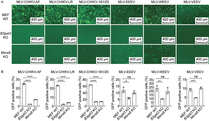 本研究图 2A中,MLV-EEEV、MLV-WEEV和MLV-VEEV在Mxra8敲除细胞中的荧光强度明显低于在MEF野生型细胞中的荧光强度,而图 2B中统计分析的差异不显著;同样,图 5A中,VRP-EEEV和VRP-WEEV在Mxra8敲除细胞中的荧光强度也有所降低,但图 5B中统计分析的差异亦不显著。这种结果的差异可能是不同检测手段导致的。荧光显微镜下视野选择具有随机性,用来观察部分细胞的荧光表达水平;流式细胞术检测全部细胞的荧光表达情况,能反映整体细胞的荧光表达水平。此外,荧光显微镜无法辨别表达弱荧光信号的细胞;而流式细胞术的检测灵敏度更高,可以捕捉更多表达弱荧光信号的细胞。