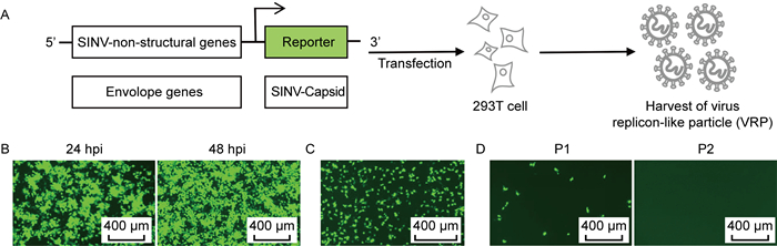 | A: Schematic diagram of VRP construction. B: Fluorescence microscopy of three-plasmid co-transfection. C: Fluorescence microscopy of SINV VRP infection on 293T cells. D: Safety verification of SINV VRP by fluorescence microscopy. hpi: hours post infection. P1: the first passage; P2: the second passage. 图 3 VRP的构建流程和安全性验证 Fig. 3 Schematic diagram of VRP construction and safety verification |
