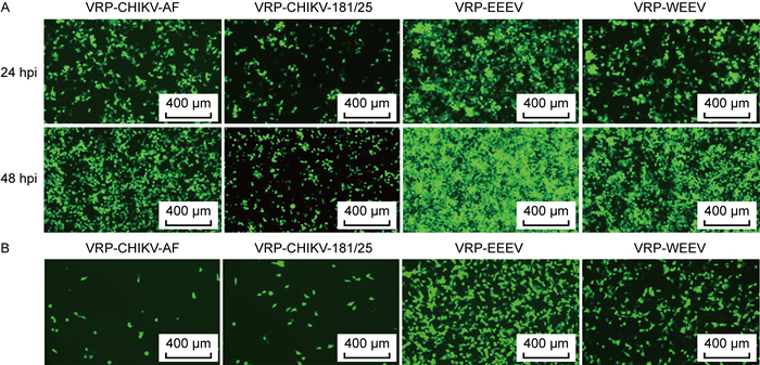 由于甲病毒基因组及其编码蛋白的相似性,不同成员间具有灵活的兼容性,可以构建含不同甲病毒包膜蛋白的嵌合VRP。因此,本研究仅通过替换表达包膜蛋白的pCAGGS-env质粒,分别包装了CHIKV-AF、CHIKV-181/25、EEEV、WEEV的嵌合VRP。在转染后24 h到48 h,可以观察到GFP阳性细胞明显增多(见图 4A)。同时,将收集的上清液感染MEF细胞,可以观察到GFP阳性细胞(见图 4B),表明不同甲病毒成员的SINV嵌合VRP包装成功。