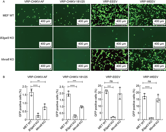 因为单轮感染的VRP可以替代活病毒成为研究入侵感染相关宿主因子的工具,本研究利用上述构建的嵌合VRP感染验证HS和Mxra8对病毒入侵的影响。与之前假病毒感染结果相似,所有VRP感染效率在B3gat3基因敲除细胞中均显著降低,而VRP感染Mxra8基因敲除细胞时,只有含CHIKV包膜蛋白的VRP感染效率明显降低,含致脑炎甲病毒EEEV和WEEV包膜蛋白的VRP感染效率没有明显变化(见图 5A、5B)。结果表明,HS是甲病毒入侵相关的通用宿主因子,而Mxra8只特异性地影响致关节炎甲病毒如CHIKV的入侵感染,与之前文献报道的结论一致[5-7]。