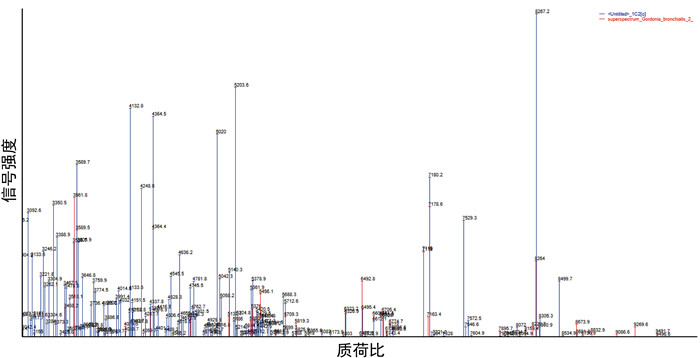 采用法国梅里埃VITEK MS微生物质谱检测系统对全血细菌纯培养物进行生物质谱鉴定分析,利用RUO数据库进行结果数据比对,鉴定此菌株为支气管戈登菌,置信度为93.0%,分析鉴定结果比对如图 5所示。