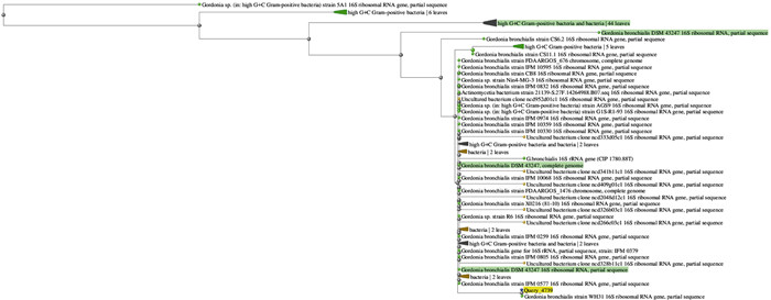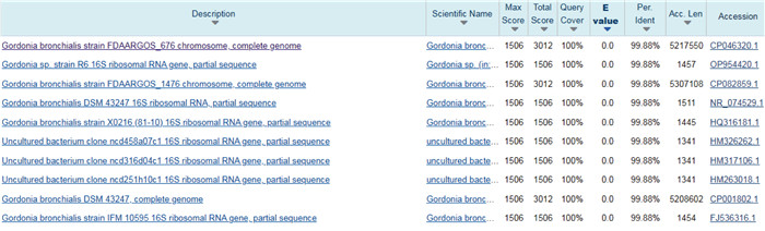 通过DNA琼脂糖切胶纯化PCR扩增产物,回收目的片段后测序,测序结果用GenBank BLAST软件进行同源性分析。PCR扩增16S rRNA的测序结果与支气管戈登菌FDAARGOS_676的相似性为99.88%(见图 6)。系统进化树结果表明,目标菌株属于戈登菌属,与支气管戈登菌亲缘关系最接近(见图 7)。