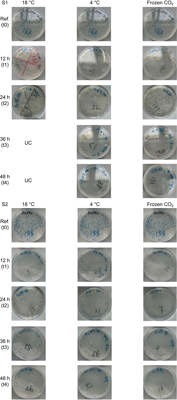 | S1: Rabbit serum, S2: Drinking water, Ref: Reference group, UC: Uncountable 图 1 不同运输温度、运输时间各样本中大肠埃希菌平板计数实验 Fig. 1 Experiments of Escherichia coli plate counts in samples with different transit temperatures and transit times |
