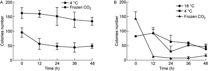 | A: Rabbit serum; B: Drinking water. 图 4 不同保藏温度、冻融次数下大肠埃希菌在样本中的活性比较 Fig. 4 Comparison of the activity of Escherichia coli in samples at different holding temperatures and different freeze-thaw times |