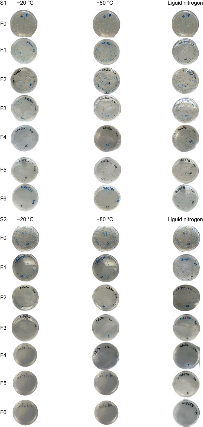 | S1:Rabbit serum, S2:Drinking water, F0: Reference group. 图 3 不同保藏温度、冻融次数下各样本中大肠埃希菌平板计数实验 Fig. 3 Experiments of Escherichia coli plate counts in samples with different holding temperatures and different freeze-thaw cycle times |