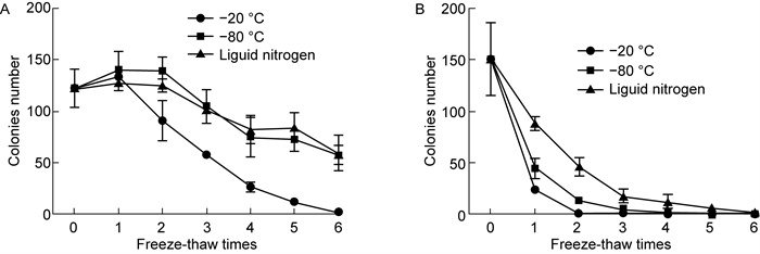 | A: -20 ℃; B: -80 ℃ 图 5 不同温度、冻融次数下大肠埃希菌在兔血清样本中的活性比较 Fig. 5 Comparison of the activity of Escherichia coli in rabbit serum samples with different temperatures and freeze-thaw times |