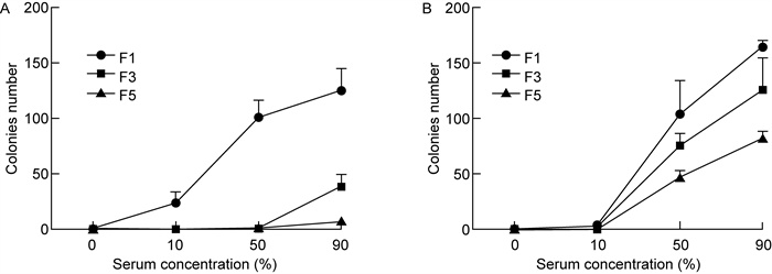 采用浓度分别为0%、10%、50%、90%的兔血清样本分别在-20 ℃和-80 ℃的保藏温度下,经过1、3、5次冻融后,观察每次冻融后不同浓度兔血清样本中大肠埃希菌活性的变化(见图 5),从血清浓度对大肠埃希菌活性的影响来看,血清模拟样本中菌落数随着兔血清浓度的增加而增加,说明在冻融过程中血清对大肠埃希菌有保护作用,并且随着血清浓度的增加,保护作用增强。-20 ℃下的反复冻融与-80 ℃下的反复冻融相比,相同浓度的血清保护作用呈减弱趋势。