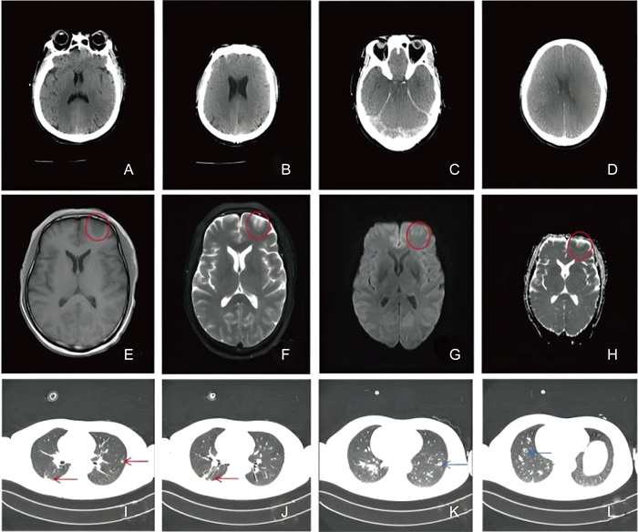 | A、B:2023年7月26日头颅CT扫描结果,脑实质未见肿胀,脑沟、脑回结构清晰;C、D:2023年7月27日头颅CT扫描结果,弥漫性脑肿胀,双侧大脑半球灰白质分界不清,脑沟脑裂明显变窄消失,脑室受压变窄;E~H:2023年7月25日头颅MRI扫描结果,左侧额叶皮层见团片状异常信号影,范围约18 mm×40 mm(左右径×前后径),T1WI呈稍低信号,局部见点状稍高信号(E),T2WI呈混杂稍高信号(F),DWI及ADC未见弥散受限(G、H);I~L:2023年7月26日胸部CT扫描结果,双肺下叶见多发斑片状、结节状高密度影,红色箭头所指可见斑片状高密度,黑色箭头所指可见空洞。 A, B: The result of cranial CT scan findings in July 26, 2023. The brain parenchyma was not swollen, and the structures of the sulci and gyrus were clear. C, D: The result of cranial CT scan findings in July 27, 2023. There was diffuse and swelling brain, poorly demarcated gray and white matter in bilateral cerebral hemispheres, marked narrowing and disappearance of the sulcus cerebralis fissure, and narrowing of the ventricles by compression. E-H: The result of cranial MRI scan findings in July 25, 2023. A mass-like abnormal signal shadow was seen in the left frontal cortex, which was about 18 mm×40 mm in extent (right and left diameters × anterior and posterior diameters), with a slightly low signal in T1WI, and localized punctate slightly high signals (E), mixed slightly high signals in T2WI (F), and no diffusion limitation was seen in DWI and ADC (G, H). I-L: The result of chest CT scan in July 26, 2023. Multiple patchy and nodular hyperdense shadows were seen in the lower lobes of both lungs, with patchy hyper density visible as indicated by the red arrows and cavities visible as indicated by the black arrows. 图 3 患者住院治疗期间各部位的影像学表现 Fig. 3 Imaging findings of various sites during hospitalization |