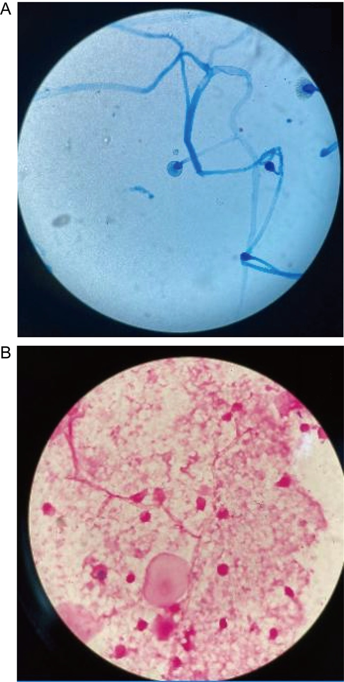 | A:乳酸酚棉蓝染色:目镜×10,油镜×100;B:革兰氏染色:目镜×10,油镜×100。 A: Latic acid phenol cotton blue staining: eyepiece ×10, oil immersion lens×100; B: Gram staining: eyepiece ×10, oil immersion lens×100. 图 2 分泌物涂片检查 Fig. 2 Smear examination of secretions |