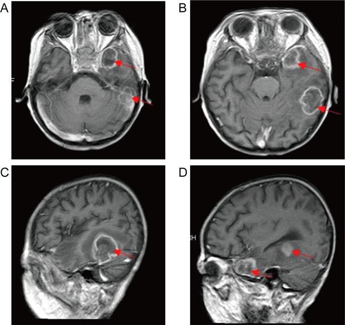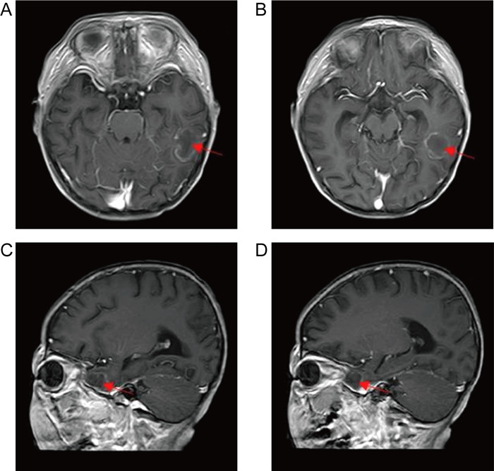 | Red arrow: Signal abnormality. 图 5 头颅磁共振增强扫描复查 Fig. 5 Reexamination of brain enhanced magnetic resonance imaging |