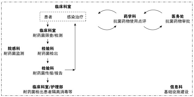 | 图 2 上海市某三甲医院遏制耐药多部门联动示意 Fig. 2 The diagram of cross-departmental collaboration for antimicrobial resistance in a Class A tertiary comprehensive hospital in Shanghai |