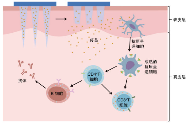 | 图 1 可溶性微针疫苗激活免疫反应 Fig. 1 Immune response activated by dissolving microneedle vaccine |
