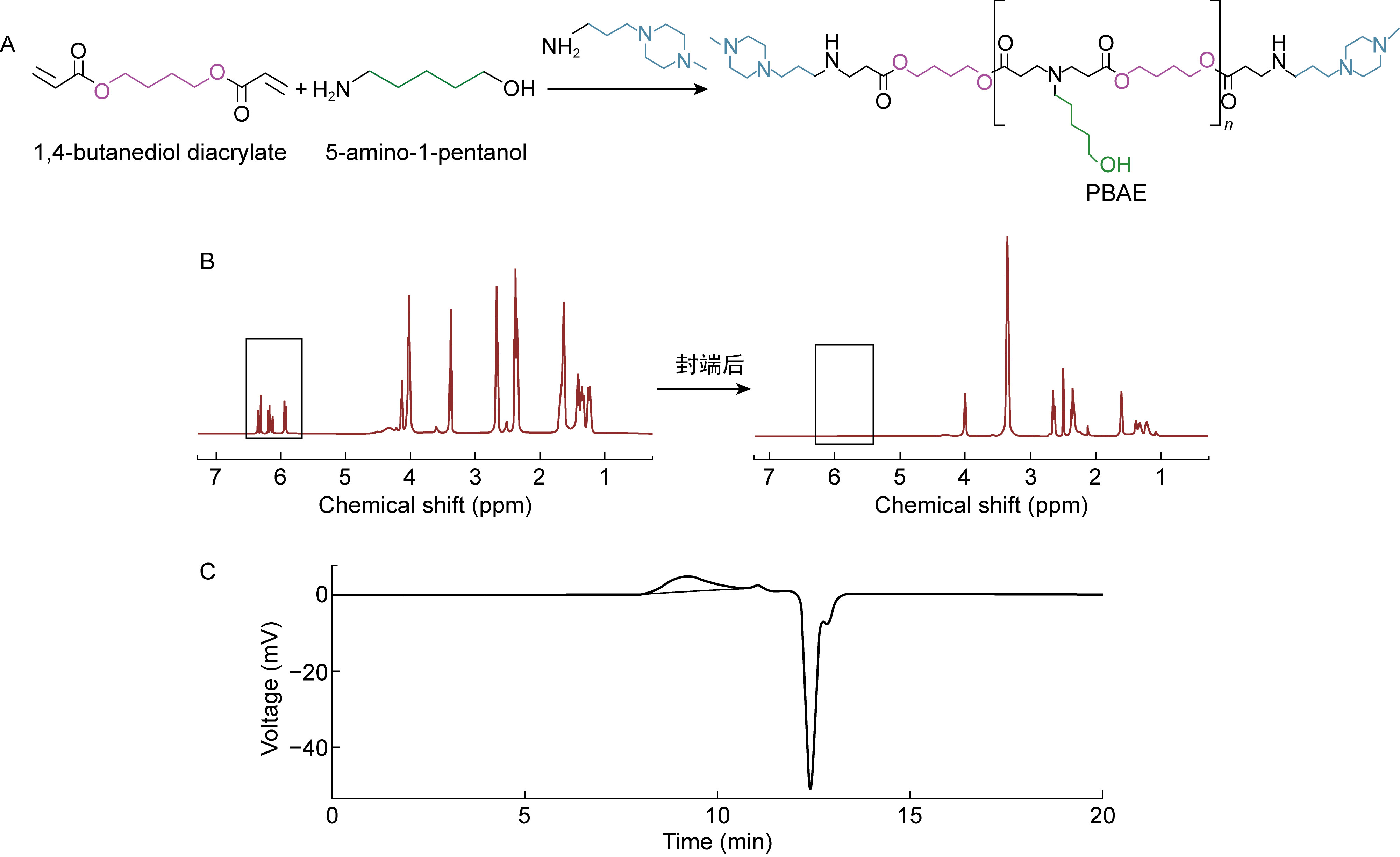 聚合物PBAE的纯度通过1H-NMR图谱表征,样品溶于氘代二甲基亚砜中。PBAE的分子量使用凝胶渗透色谱(gel permeation chromatography,GPC)测定,流动相为四氢呋喃。