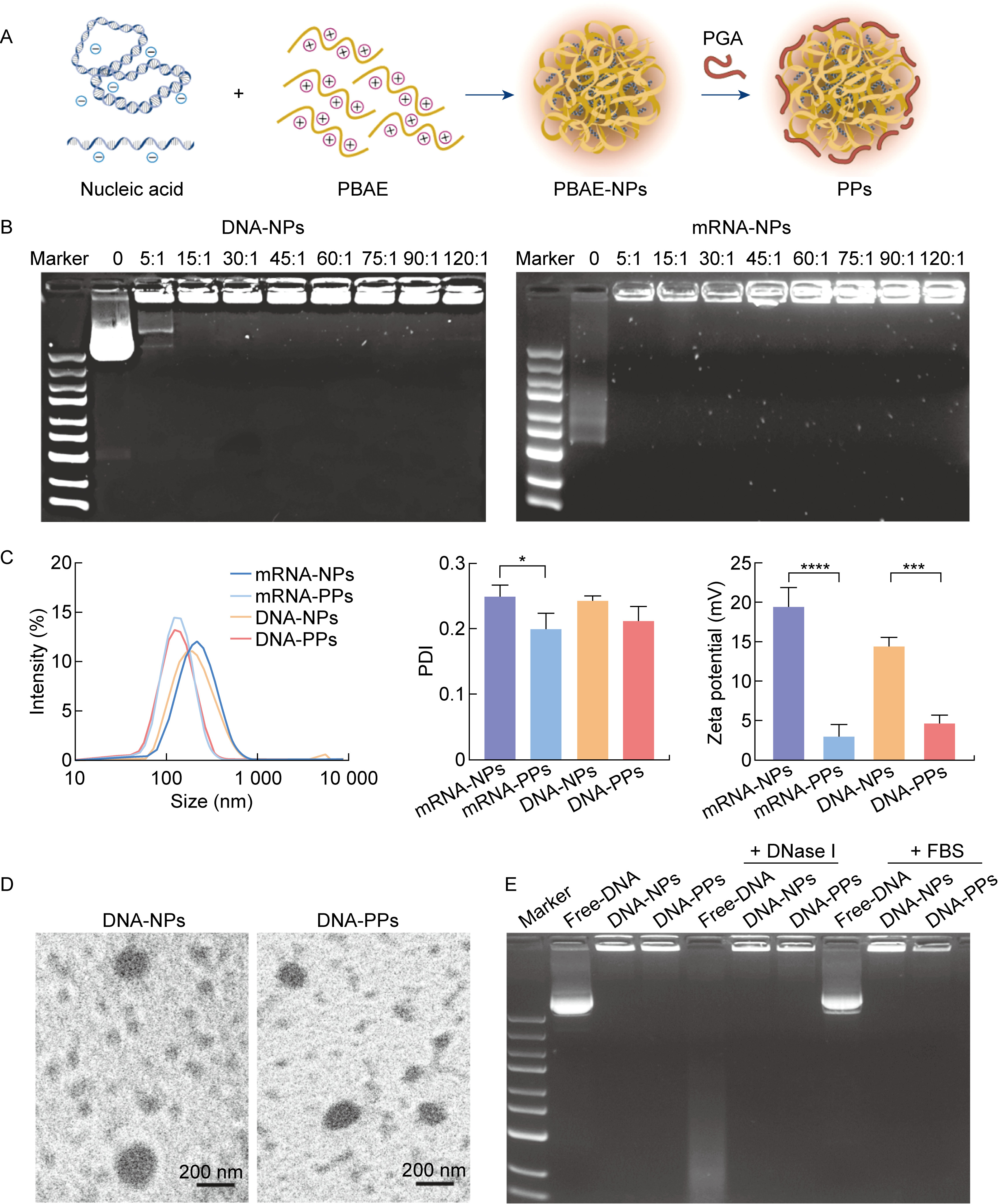 阳离子聚合物PBAE通过分子内带正电荷的氨基与带负电荷的核酸之间的静电相互作用,有效地压缩核酸,形成PBAE-NPs。本研究进一步利用带负电荷的PGA对PBAE-NPs进行修饰,构建了核-壳式核酸递送载体PPs(见图 2A)。