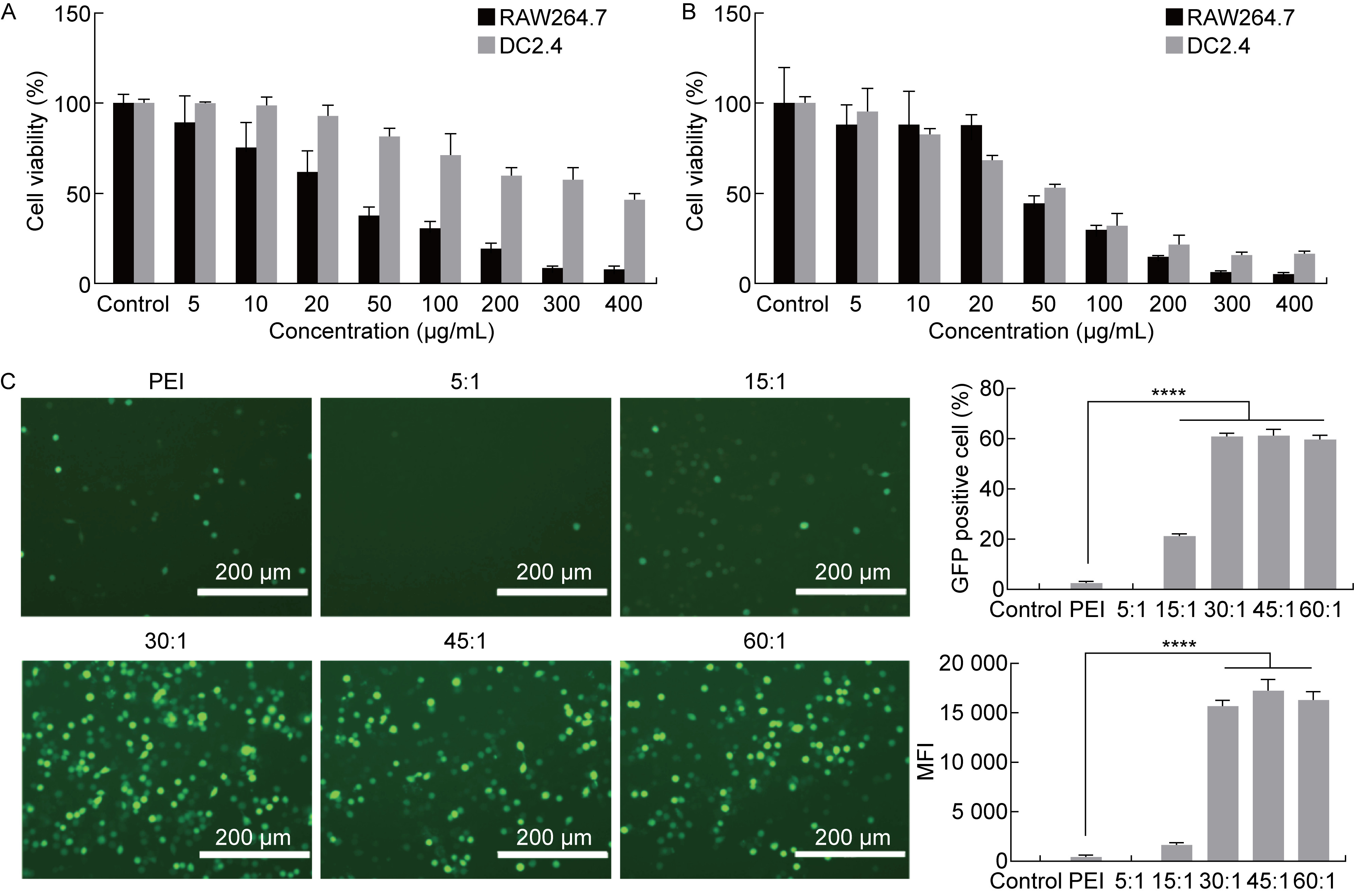 2.3 PBAE-NPs细胞转染能力检测巨噬细胞和树突状细胞是2种常见的抗原呈递细胞。为了筛选出阳离子聚合物PBAE合适的工作浓度,使用CCK-8法考察不同浓度的PBAE对DC 2.4细胞和RAW 264.7细胞的细胞毒性(见图 3A、B)。结果显示,随着聚合物PBAE浓度的提高,其细胞毒性逐渐增加。当PBAE浓度低于50μg/mL时,细胞存活率较高。此外,PBAE与细胞共孵育时间越久,产生的细胞毒性越大。因此,本研究选择在细胞转染4 h后更换新鲜培养基以降低细胞毒性。