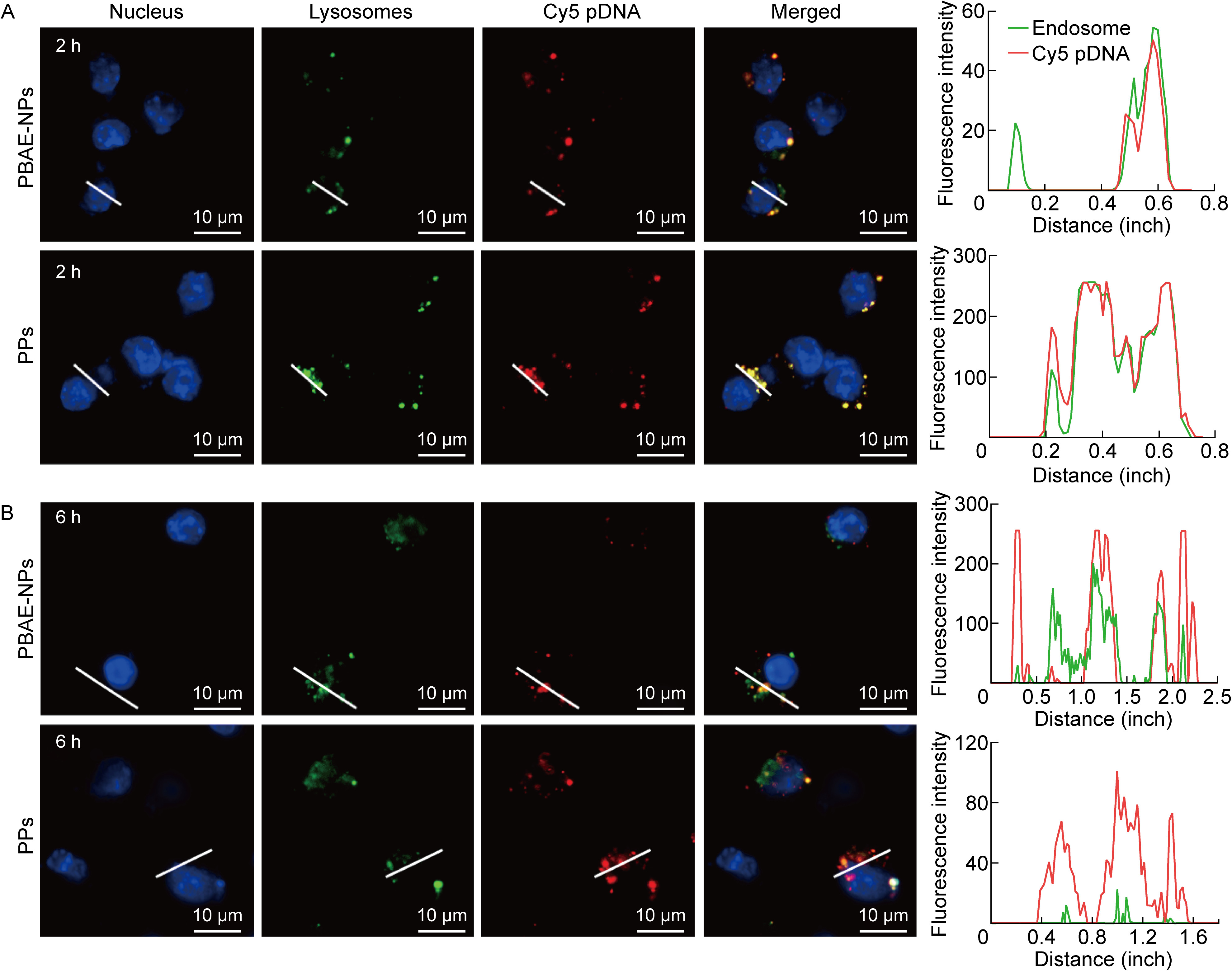 | A: Confocal fluorescence images of RAW 264.7 cells incubated with PBAE-NPs and PPs for 2 h. B: Confocal fluorescence images of RAW 264.7 cells incubated with PBAE-NPs and PPs for 6 h. Blue: cell nuclei; Green: lysosomes; Red: Cy5-DNA. 图 4 PBAE-NPs和PPs的溶酶体逃逸能力 Fig. 4 Lysosomal escape ability of PBAE-NPs和PPs |