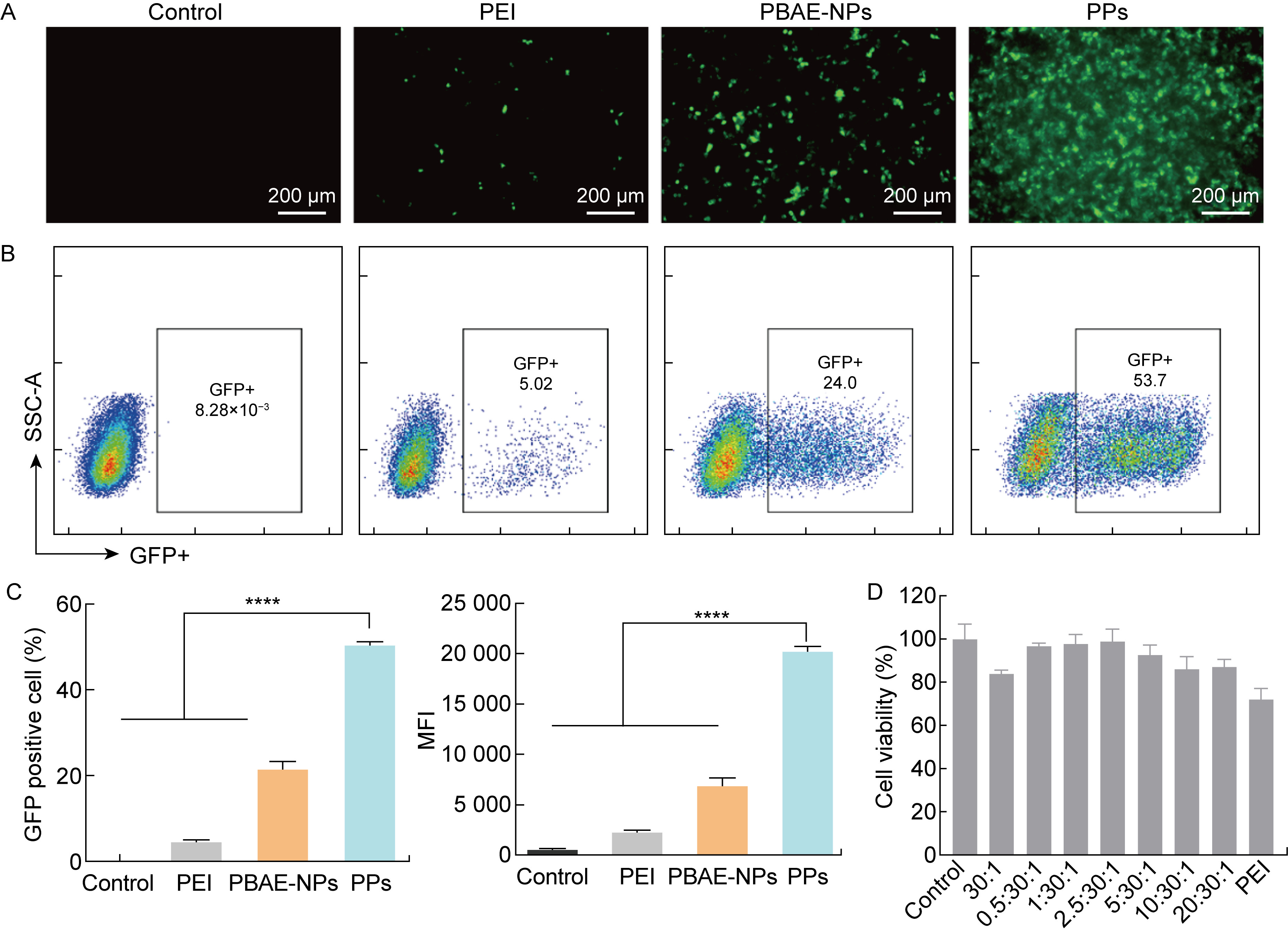 | A: Fluorescence imaging of DC 2.4 cells transfected by pEGFP-N1 plasmid loaded PBAE-NPs and PPs. B: Quantitative transfection efficiency by flow cytometry. C: The percentages of GFP positive cells and mean fluorescence intensities (MFI) from DC 2.4 cells transfected by PBAE-NPs and PPs. D: Cytotoxicity of various nanoparticles on DC 2.4 cells. Cells were incubated with PBAE-NPs (weight ratio 30:1) and PPs (weight ratio 0.5∶30∶1, 1∶30∶1, 2.5∶30∶1, 5∶30∶1, 10∶30∶1, 20∶30∶1, respectively) for 24 h. ****: P < 0.000 1. 图 5 PPs具有安全、高效的核酸转染性能 Fig. 5 PPs show high gene delivery in vitro |