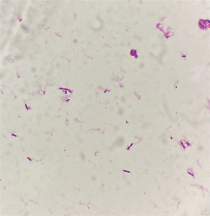 | 革兰氏阴性杆菌,形态粗大。 Gram negative bacilli with a stout morphology. 图 1 革兰氏染色镜下涂片(10×100) Fig. 1 Gram staining microscopic smear(10×100) |