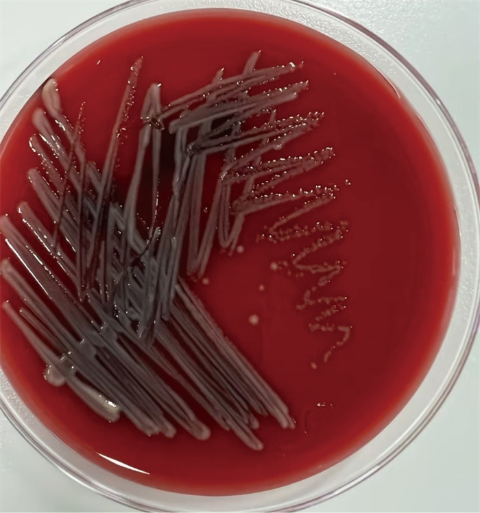 | 形态湿润,有β溶血。 Moist in appearance with β hemolysis. 图 2 血平板菌落形态 Fig. 2 Colony morphology of blood plate |