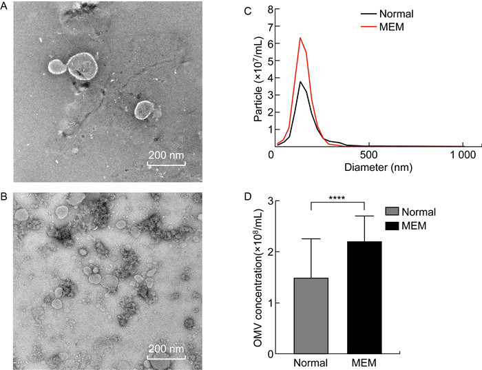 图 1A,B显示在2种条件下产生的OMV都具有明显双层膜结构。图 1C,D结果显示,在2种条件下分离的OMV峰值直径相似,但颗粒浓度数量级上有显著差距,美洛培南刺激组培养的OMV (MEM-OMV)的颗粒浓度明显高于正常LB肉汤培养组的OMV(Normal-OMV),MEM-OMV的颗粒浓度是(2.20±0.53)×108/mL,Normal-OMV的颗粒浓度是(1.50±0.76)×108/mL(P < 0.000 1)。如表 2所示,两组的OMV大小的差异并不显著,Normal-OMV平均直径为169±75.5 nm,MEM-OMV的平均直径为150.2±50.3 nm。