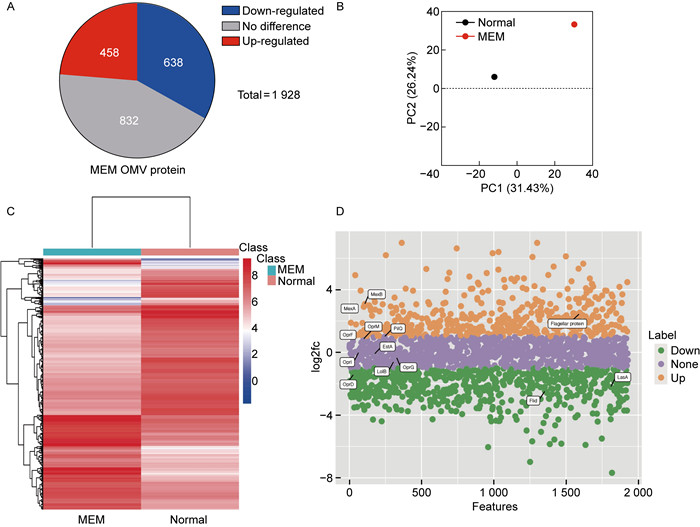 2.3.1 P. aeruginosa OMV 的蛋白质种类总览从P. aeruginosa ATCC27853菌株的OMV中提取蛋白质消化成肽段,使用LC-MS/MS技术进行分析,并比较这些在不同生长环境下P. aeruginosa的OMV蛋白质,以期发现不同OMV中蛋白质的选择性富集。如图 2A所示,在P. aeruginosa蛋白质数据库检索到的1 928种蛋白质中,与Normal组相比,MEM-OMV表达上调的蛋白有458种,表达下调的蛋白有638种,但某些蛋白质的含量没有区别,共有832种。图 2B的主成分分析(principal component analysis,PCA)以及图 2C的蛋白质丰度热图显示,MEM-OMV和PMB-OMV的蛋白质组成与正常组相比差异较大,美洛培南在培养基中对P. aeruginosa的某种作用,使得部分蛋白质被选择性更多或更少地进入OMV。此外,MEM-OMV中外排泵蛋白MexA、MexB和鞭毛蛋白的含量显著增多,外膜蛋白OprD、Flid以及毒力因子LasA的含量显著减少(见图 2D)。