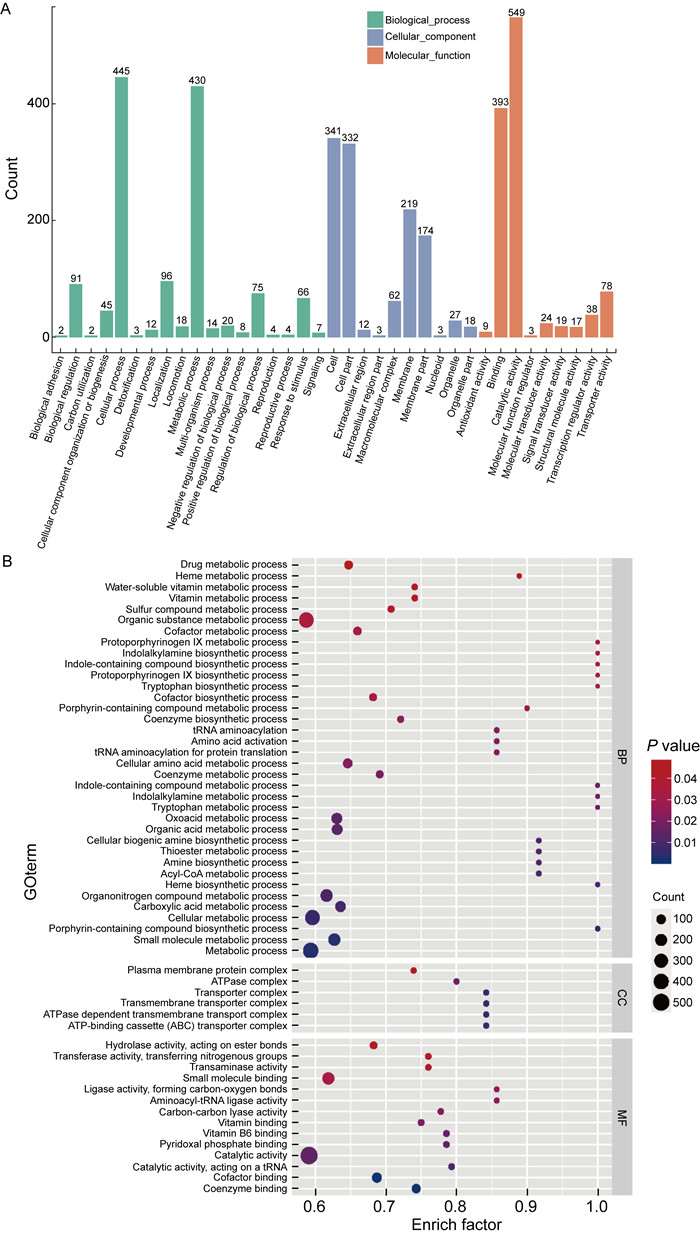| A: Species distribution of proteins in MEM-OMV; B: Bubble plots of GO analysis on differential proteins between MEM-OMV and Normal-OMV. 图 3 两组P. aeruginosa OMV差异蛋白的GO分析 Fig. 3 GO analysis of differential proteins of P. aeruginosa OMV in two groups |