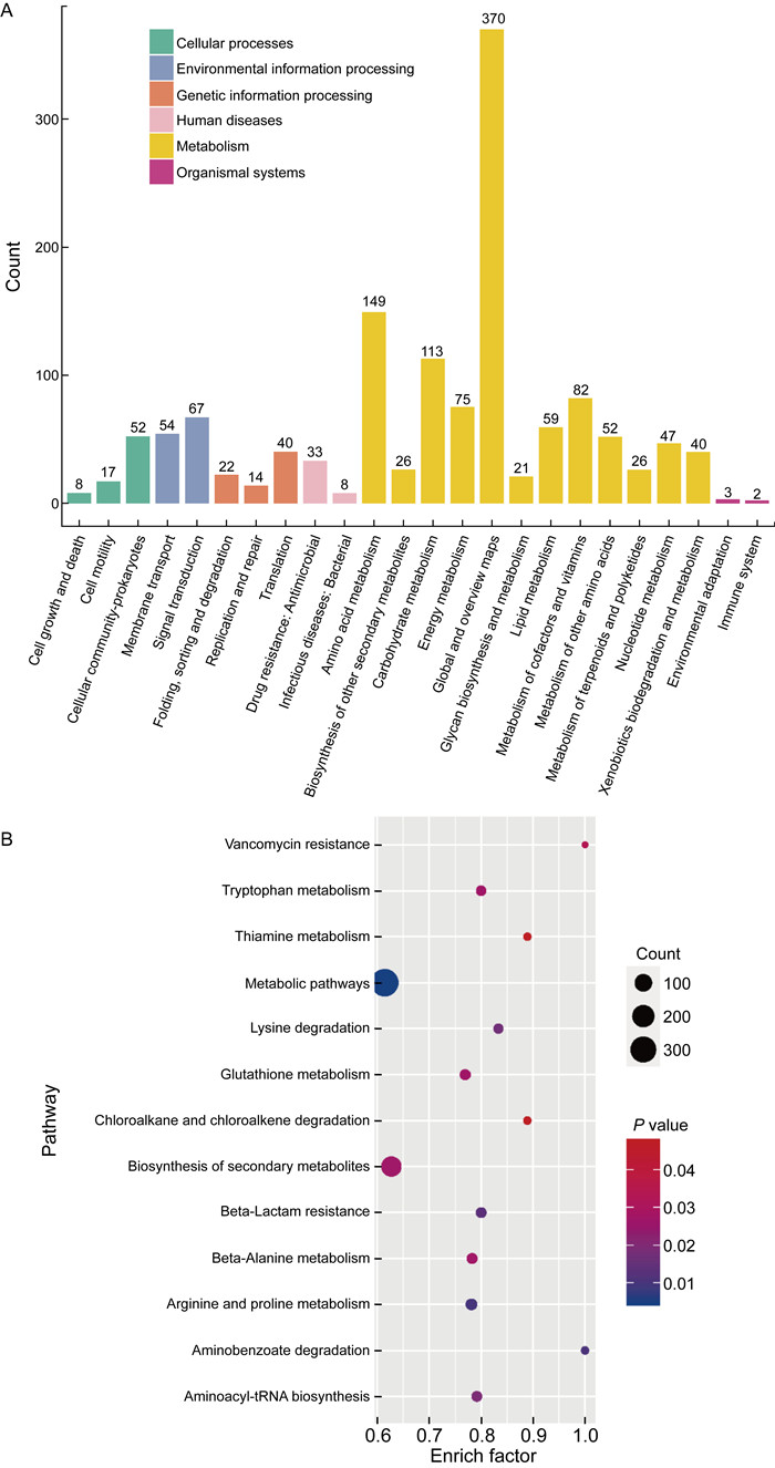 | A: Distribution of functional pathways of proteins in MEM-OMV; B: Bubble plots of KEGG pathway analysis on differential proteins between MEM-OMV and Normal-OMV. 图 4 两组P. aeruginosa OMV差异蛋白的KEGG分析 Fig. 4 KEGG analysis of differential proteins of P. aeruginosa OMV in two groups |