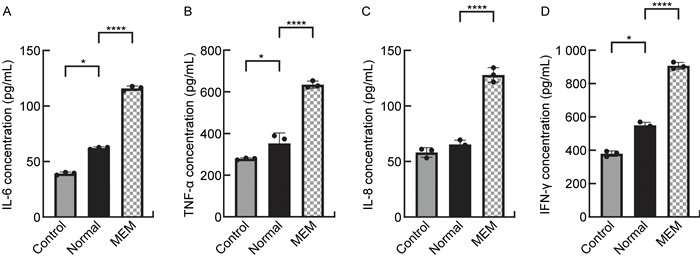 1.1.2 主要试剂Luria-Bertani(LB)培养基(生工科技,中国);美洛培南(meropenem)干粉(Abmole,美国);DMEM高糖培养基、青霉素-链霉素双抗溶液(Hyclone,美国);澳洲胎牛血清(fetal bovine serum, FBS)、0.25%含EDTA胰酶(Gibco,美国);IL-6, TNF-α, IL-8和TNF-γ ELISA试剂盒(复申科技, 中国);SteadyPure通用RNA提取试剂盒,Evo M-MLV RT Premix for qPCR,SYBR Green Premix Pro Taq HS qPCR Kit(艾科瑞生物,中国);BCA蛋白浓度测定试剂盒(增强型)(碧云天,中国)。